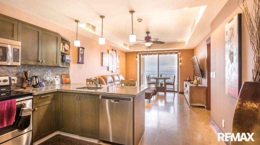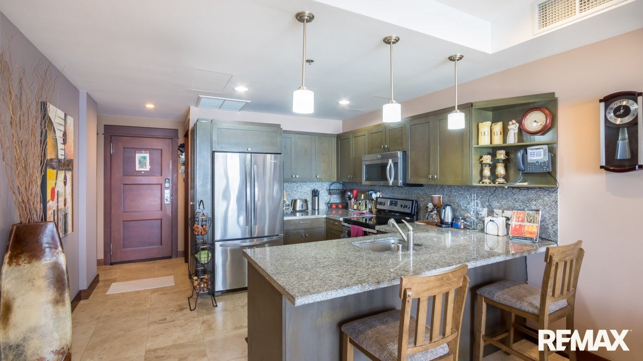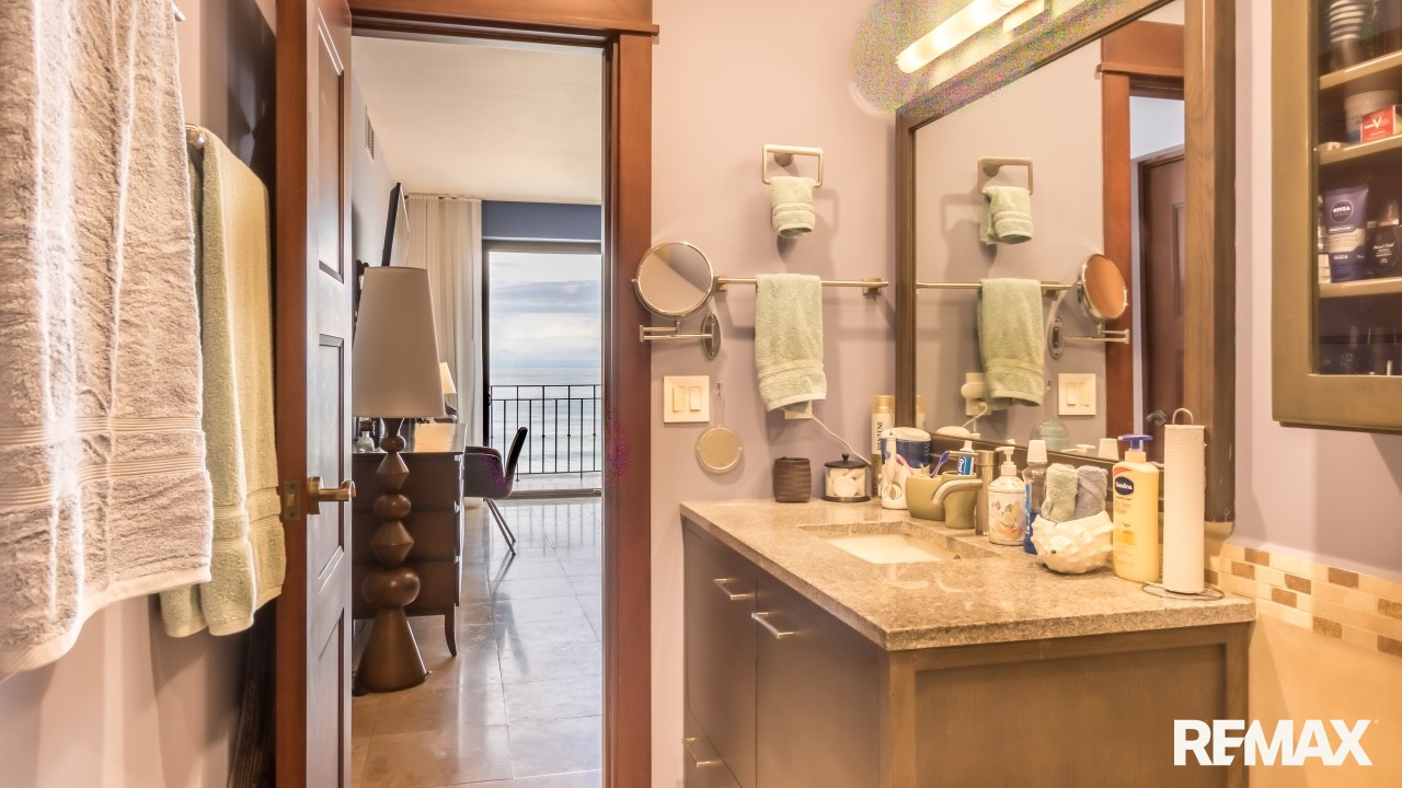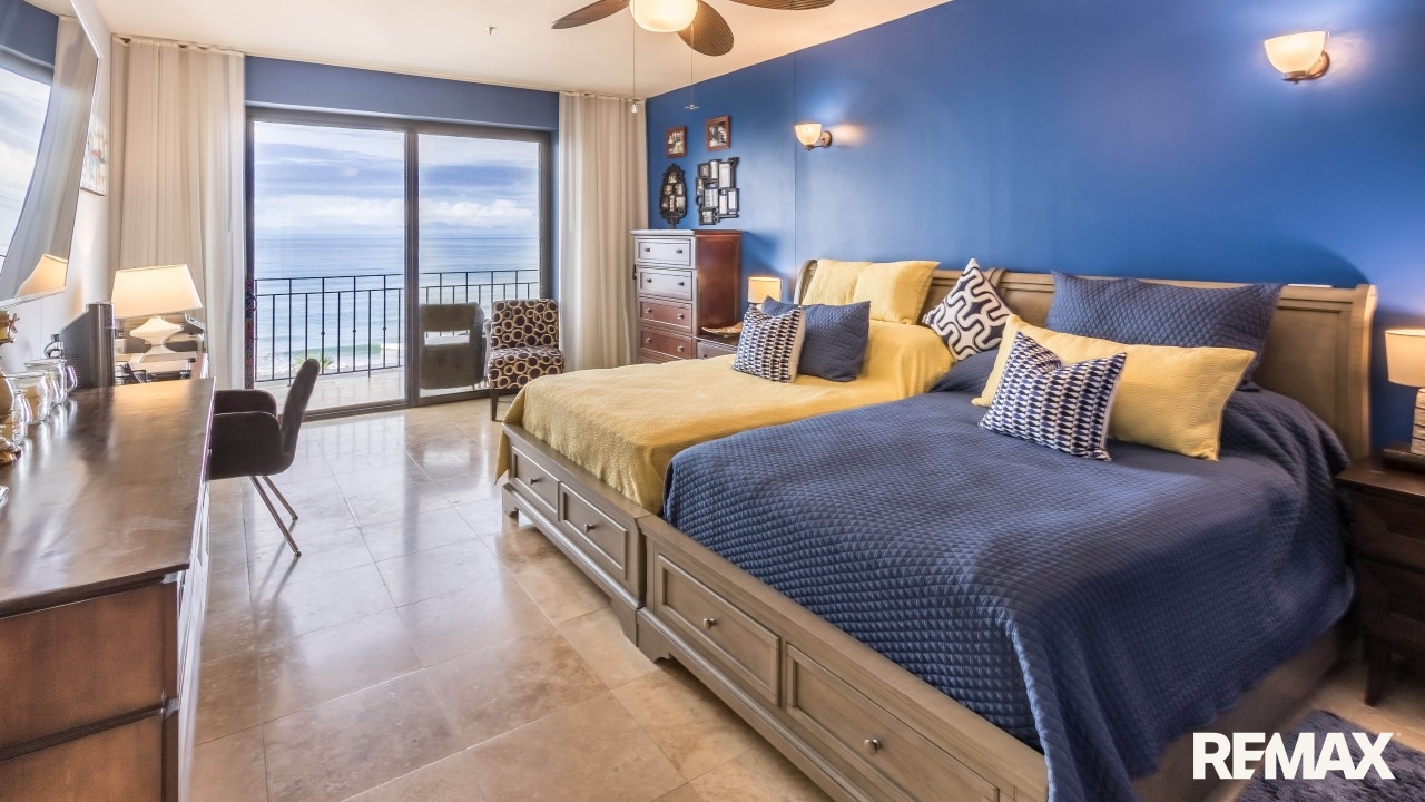 The spacious bedroom offers comfort and privacy with its own private balcony, walk-in closet, and ensuite bathroom. A second balcony off the living area creates another inviting place to relax and enjoy the ocean breeze. The condo also includes a half bathroom for guests and a separate laundry room, adding convenience and functionality. High-end finishes such as granite countertops and stainless steel appliances complete the home’s luxurious feel.
