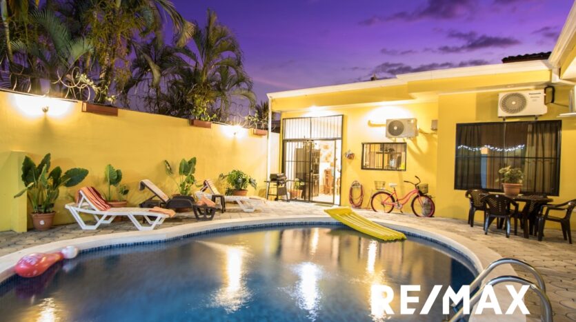 Renovated | Private Pool home is located in Jaco Sol, only 2 blocks from the beach and within walking distance of downtown Jaco. This home has been recently remodeled and is ready for you!! Driving up to the home, you will see a great front yard and ample parking for 4 cars. Entering the front door, you walk into the large open floor plan living, dining, and kitchen area which leads out to the great backyard with a private pool and bathroom. Inside you have 2 bedrooms with a Jack-and-Jill bathroom, and a large master suite with a master bath.