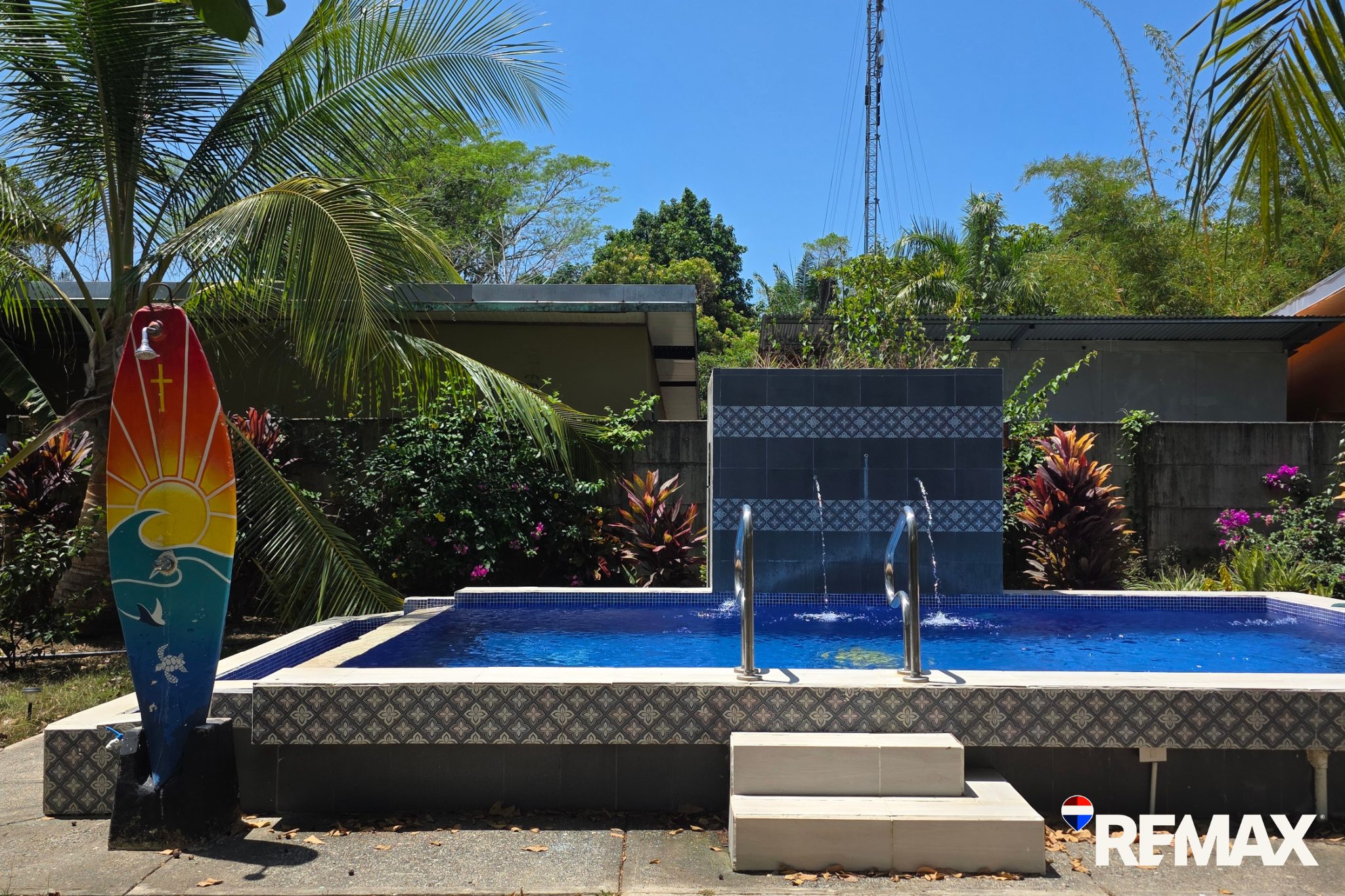 Outside, the property offers a beautifully designed swimming pool with built-in lounge chairs, creating the perfect space to relax and enjoy the warm Pacific climate. The expansive 953 m² lot provides plenty of room to expand, with the potential to build an additional home, guest house, or apartments.